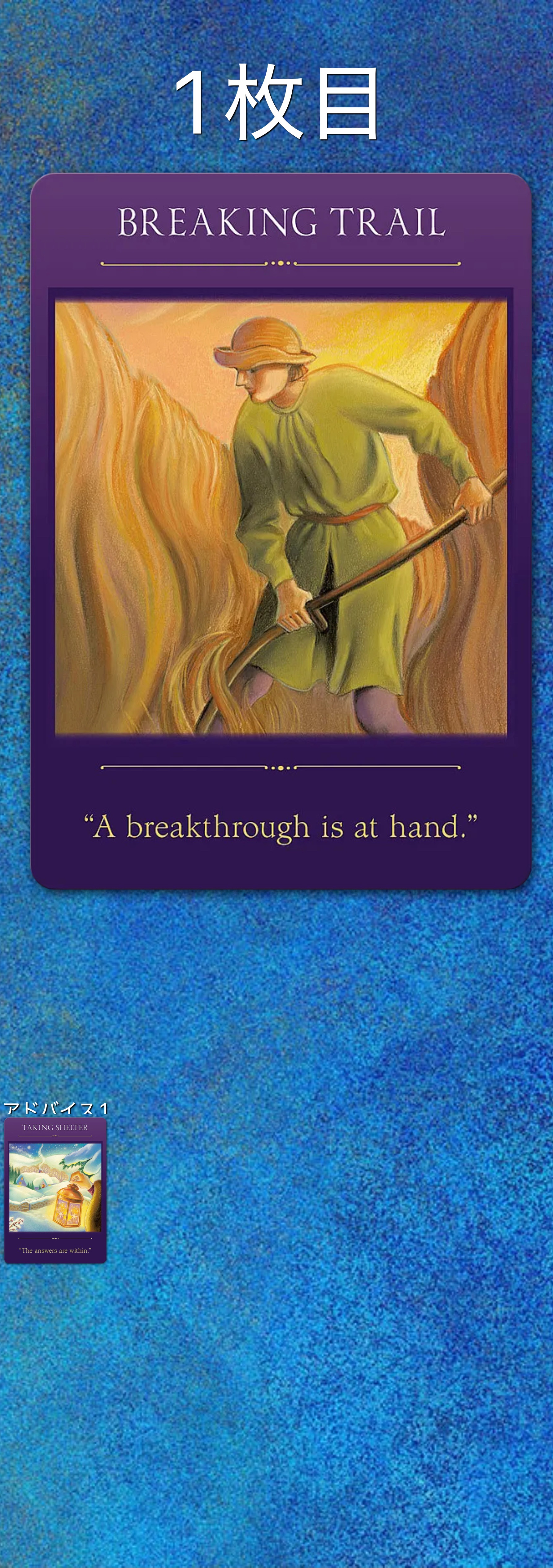 道に従って進むのではなく、自分の道を作ることが重要です。人生の崖っぷちに立ちすくむのはやめて、思いきり跳躍する時なのです。これまでの忍耐が報われます。古い制限や内なるブロックは次第に消えていくでしょう。怖れに足止めされないでください。今こそ怖れをしっかりと味わい、そのうえで行動に出るべきです。長いあいだ待っていた何かが、ようやく実を結ぼうとしています! 思いきって大胆に飛び込んでください。あなたの努力によって、後から来る人々の道ができるでしょう。★アドバイスカード 1枚目